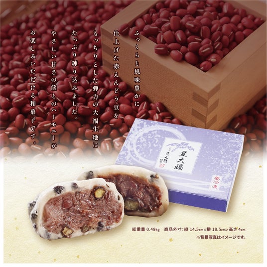 ふっくらと風味豊かに仕上げた赤えんどう豆をもっちりとした弾力の大福生地にたっぷり練り込みました。
