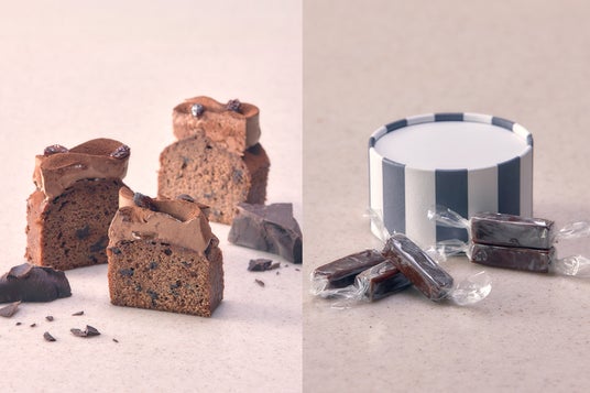 表面はカリッと、中はしっとりとしたチョコレートフィナンシェに、ザクザク食感のチョコレートクランブルを合わせました。チョコレートと相性の良いオレンジピールを忍ばせています。
