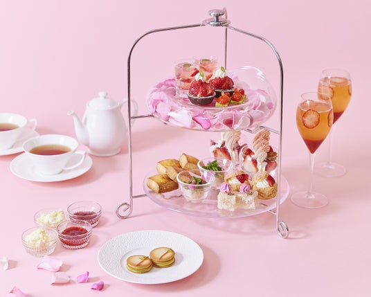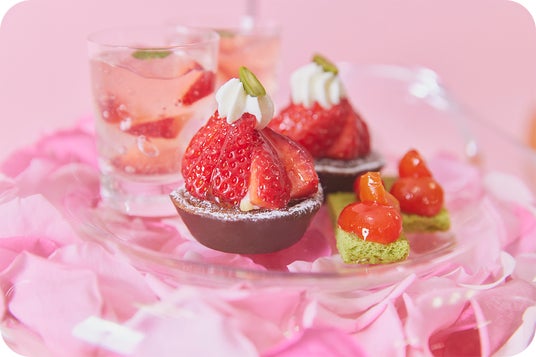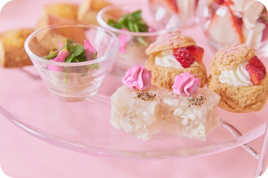 さくらや苺、春の訪れを感じるピンクのスイーツを集めた春満開のアフタヌーンティーセット。上品な苺のタルトやキラキラ輝く美しいジュレに、ワクワクと心が躍ります。新作4品を含む全9品の小菓子と、お好みのドリンクを2杯までご注文いただけます。また、フォトジェニックな見た目のウェルカムドリンク「フレッシュイチゴのスパークリングカクテル」付きのプランもお選びいただけます。春色のテラスで至福のアフタヌーンティーをご堪能ください。