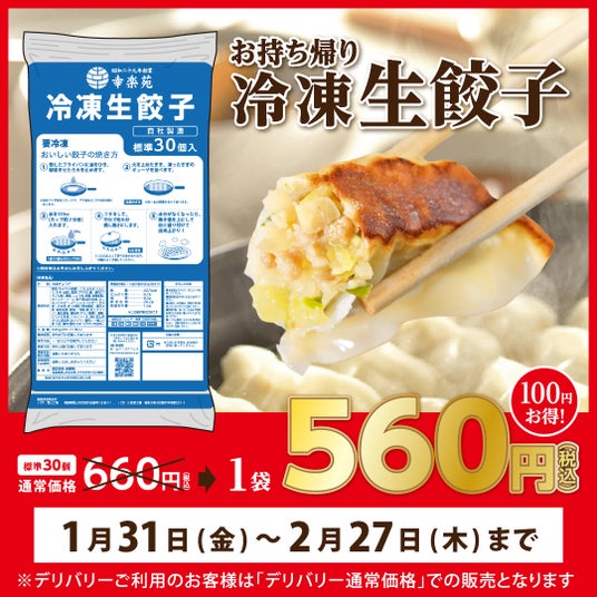 さらに、1月31日(金)~2月27日(木)まで、お持ち帰り「冷凍生餃子」(1袋標準30個入り)を、通常より100円お得な特別価格560円にて販売するキャンペーンも開催いたします。