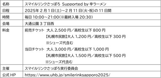 「笑う冬には、福来たる」をキャッチフレーズに開催する「スマイルリンクさっぽろ Supported by辛ラーメン」は、札幌市の観光推進施策として、今年も開催されます。会場は前年の赤れんが庁舎前の広場「アカプラ」から今年は大通公園3丁目西に移動し、さっぽろ雪まつりの連携事業として開催いたします。11日間、国内外からの観光客や市民の方に、札幌の新たな夜観光アクティビティとして、アイススケートをお楽しみいただけます。アクティオは、この「スマイルリンクさっぽろSupported by辛ラーメン」のスポンサーとして、本イベントを盛り上げていきますので、是非ご期待ください。