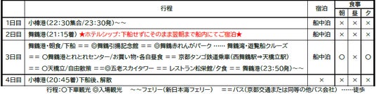 新日本海フェリー往復乗船代(基本:ツーリストA)・食事代(朝1回・夕1回)・バス代(3日目)・舞鶴湾遊覧船乗船代・京都丹後鉄道運賃代・舞鶴引揚記念館入館料・赤れんが博物館入館料・五老スカイタワー・消費税等諸税・保険代