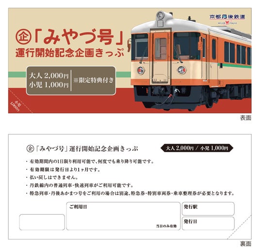また、運行開始に合わせて「『みやづ号』運行開始記念企画きっぷ」を販売します。丹鉄線内の普通・快速列車が乗り放題で、利用日当日は何度でも乗り降りしていただけます。