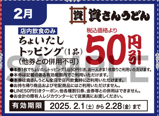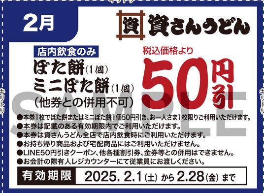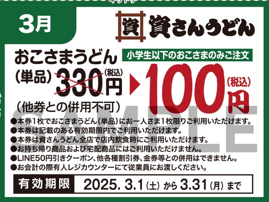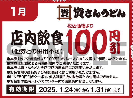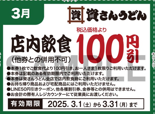 店内飲食でご利用いただける100円クーポンは3月にも登場。我慢していた贅沢メニューも試すもよし、いつものメニューを100円引きでお得感を味わうも良し!春休み中のご家族でのお食事や、お仕事中のサクッとランチなど、お財布に忍ばせてオトクに「資さんうどん」をお楽しみください!