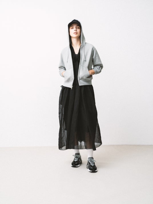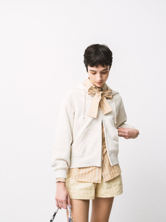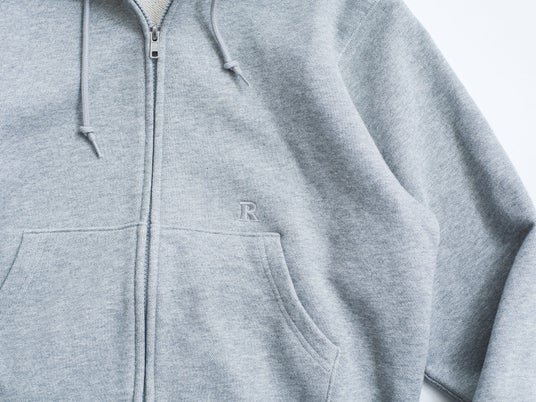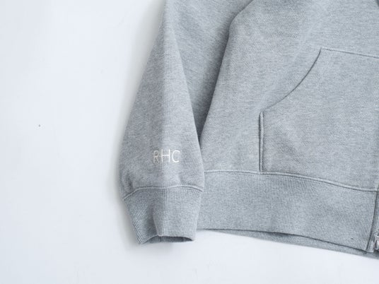 季節の変わり目に重宝するフルジップフーディをデイリーかつファッショナブルにお楽しみいただけるよう、ワードローブに心強いアイボリー・グレー・ブラックの3色展開で、着丈を程よく短くしコンパクトなシルエットで仕上げました。フロント部分と袖元にさりげなく施された「R」と「RHC」とロゴがポイントです。
