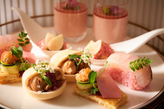 セイボリーには、春子鯛の旨味が引き立つ「桜昆布寿司」、桜海老と卯の花を使った「和のタルト」、西京味噌に漬け込んだクリームチーズなど、喫水線の料理長 天田内が趣向を凝らしたアイテムをお楽しみいただけます。抹茶やグリーンピースの春らしい色彩とともに、心ほどける春のティータイムをお楽しみください。