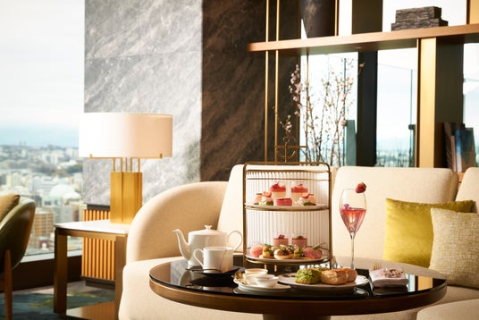 最上階23階から横浜の美景を望むことができるロビーラウンジでは、心躍る麗らかな季節にふさわしい「桜と苺のアフタヌーンティー」をご用意しております。ほんのり桜色に染まった華やかなメニューが、特別なティータイムを演出します。