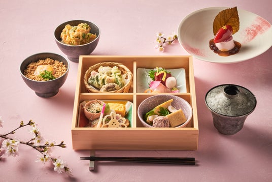 3階喫水線では、春の彩りと旬の味覚を詰め込んだ「桜ランチ弁当」をご提供いたします。ほのかに桜の香りが漂う「桜胡麻豆富の湯葉包み揚げ」ほか、瑞々しい芹や筍などの春野菜、桜鯛や桜海老の滋味深い素材の味わいが、春の訪れを感じさせる一折です。3色の花見団子も添え、春を存分に感じられる特別なお弁当です。