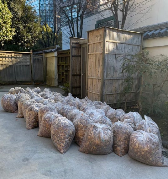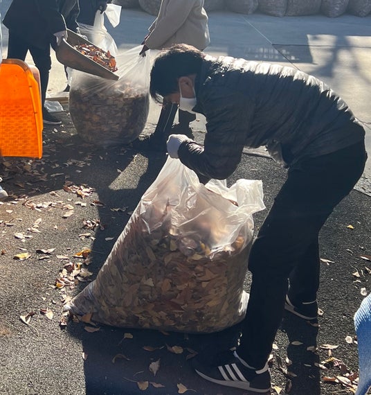 今年度は、当社(グループ会社含む)から24名、同校生徒21名、教員10名の総勢55名が清掃活動に参加し、小石川後楽園スタッフのサポートのもとに90リットルの袋およそ100袋分(約9,000リットル)の落ち葉を収集しました。