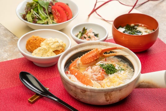 「蟹雑炊」に「蟹サラダ」「カニクリームコロッケ」「蟹の酢の物」がついた蟹尽くし定食