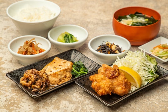 ■からだ想いの一汁三菜定食 『鶏の唐揚げと肉豆腐のおばんざい定食』1,250円(税込)