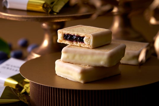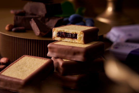 ハスカップを使用した甘酸っぱい味わいのジャムをバタークリーム、薄焼きクッキーでサンドしています。周りをチョコレートで縁取りました。