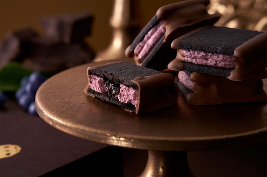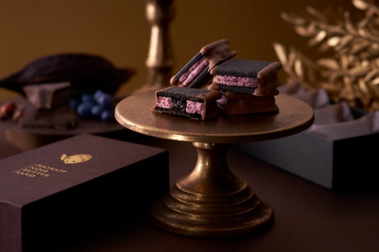 口どけが良くカカオの香り漂うココアバタークリームと、ハスカップを使用したジャムをブラックココアクッキーでサンドしています。仕上げにほろ苦いチョコレートで縁取った、冬限定のジュエリーシリーズ。