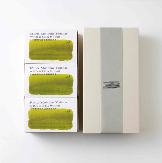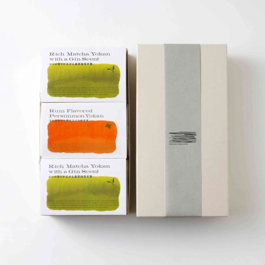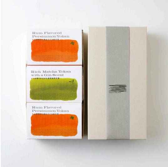 ラム酒香る二層仕立ての柿羊羹2個とジンの香りが広がる濃厚抹茶羊羹1個のセット。