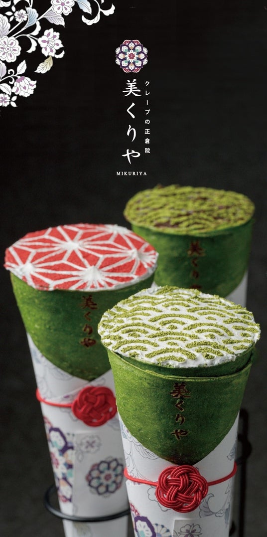 日本初の文様和クレープ。抹茶は奈良の大和茶を使用。巻紙には正倉院文様をあしらい、日本古来の水引と焼印をアクセントに。日本・奈良の和をモチーフにしたオンリーワンのクレープ。