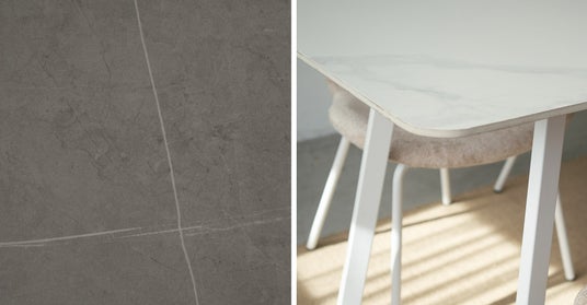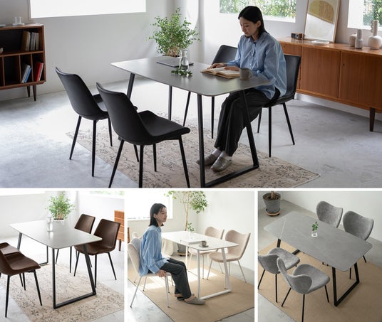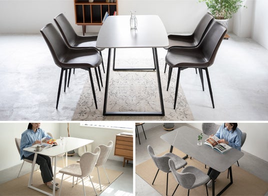 石目調の高級感あふれるセラミックテーブルはホワイトマーブルとストーングレーの2色展開です。チェアはご自宅のものを組み合わせたり、別途お買い求めいただく形となります。