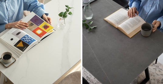 見た目も使い勝手も妥協したくない。石目調の高級感あふれるセラミックダイニングテーブルと、選べる2種類のダイニングチェアのセットが、日常をワンランク上の空間へ導きます。