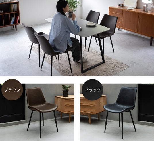 洗練されたデザインのレザー調チェアは、曲線的なフォルムの座面に細身のブラックスチールを組み合わせ。シンプルながら高級感漂うデザインに仕上げました。座面の奥行が広く、しっかりとした座り心地。背もたれが背中に優しくフィットし支えます。シックでモダンな印象のダイニングセットです。テーブルはグレーのみお選びいただけます。チェアはブラウンまたはブラックの同色4脚セットからお選びいただけます。