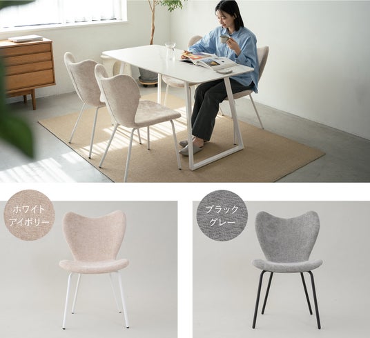 立体形状の積層合板にシート状のウレタンフォームを沿わせ、優しく快適な座り心地を実現したチェアです。モール糸を使って織り込まれたふんわりとやわらかな生地で、立体シートを丁寧に包んでいます。地厚で耐久性が高いだけでなく、適度なクッション性があるため、冬場のひんやり感がありません。チェアは同色4脚が付属します。テーブルの色に合わせてホワイトとグレーの2種類のカラーをご用意しました。