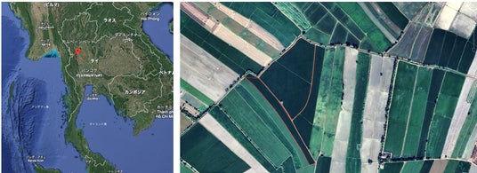 ○左:タイ北部カンペンペーット県(参照:Google Earth)、右:パイロット実証地の圃場