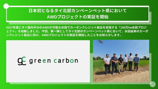 ネイチャーベースのカーボンクレジット創出販売事業を展開するGreen Carbon株式会社(代表取締役:大北潤、以下Green Carbon(読み;グリーンカーボン))は、2027年度にタイ国内半分のAWD(間断灌漑※1)が可能な水田でカーボンクレジット創出を目指する「150万ha水田プロジェクト」を始動しました。今回、第一弾としてタイ北部のカンペーンペット県において、水田由来のカーボンクレジット創出に向け、AWDプロジェクト(以下、本プロジェクト)の実証を開始したことをお知らせします。