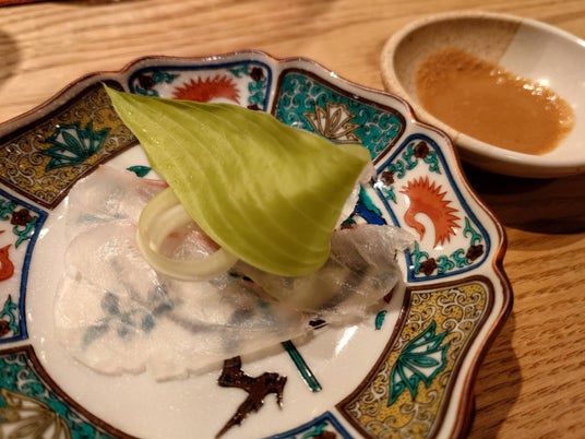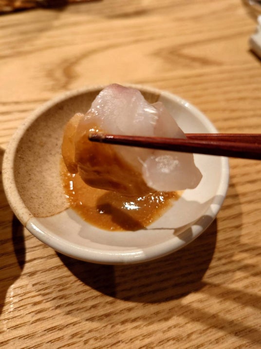 タマクエの刺身はあん肝醤油につけて