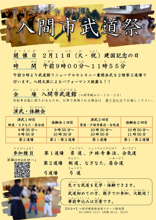 2か年にわたる大規模改修工事を終え、最新設備を備えた入間市武道館がリニューアルオープン!改装後初めての大規模スポーツイベントとして、令和7年2月11日(火・祝)に「第32回入間市武道祭」を開催します。
