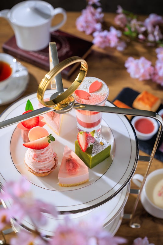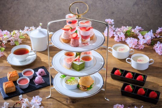 予約受付開始から数日で満席となった「苺とチョコレートのアフタヌーンティー(2月21日まで提供)」に続き、春の苺を楽しめるアフタヌーンティーをご用意します。苺と、春の代名詞である桜をテーマに、可憐な春色スイーツとセイヴォリーが3段のティースタンドに並びます。