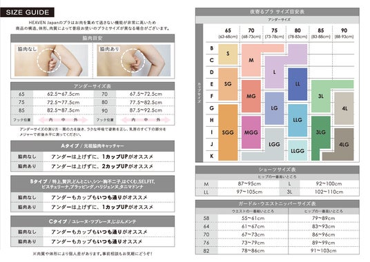 体形や骨格、バストの形は人それぞれで違うため、自分にぴったり合ったブラジャーのサイズ選びはとてもデリケートです。そこで本カタログではホック位置でのアンダーサイズの違いや、脇肉の有無といった体形に合わせてサイズを選べるように目安が記載されています。