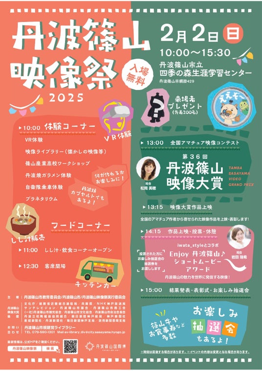 イベント内では、VR技術を使った映像体験や丹波焼コーナー、丹波篠山名物のしし汁の販売などが午前中から開催され、午後からは「第36回丹波篠山映像大賞」や「Enjoy 丹波篠山♪ ショートムービーアワード」の上映、大賞決定の表彰式など1日を通して映像作品に触れることができますので、是非ご参加ください。