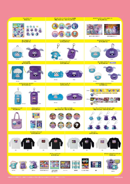 ポップで狂気的な「ホイッピ&ラッピ」の世界観を落とし込んだ店内にて、人気のぬいぐるみや、イベント限定品の「3連アクリルキーホルダー」「クリアマルチケース」をはじめとする種類豊富なグッズを販売いたします。