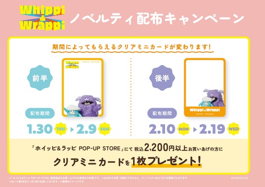 さらに、開催期間中「ホイッピ&ラッピ」関連商品を合計2,200円(税込)以上ご購入の方に、特典として前半と後半で異なるデザインのオリジナルクリアミニカードを1枚プレゼントいたします。