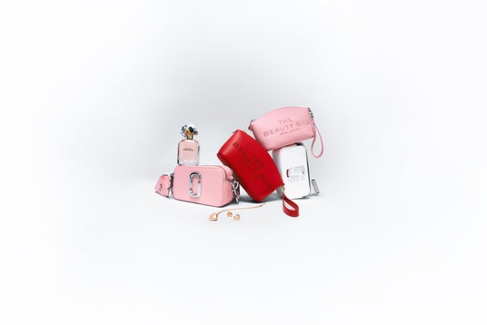 左から、ザ ソリッド スナップショット ¥57,200 / パーフェクト マーク ジェイコブス オードパルファム 100ML ¥20,790 / バルーン ハート ネックレス ¥15,400 / バルーン ハート ピアス ¥14,300 / ザ レザー ビューティー バッグ ポーチ ¥15,400 ※税込価格表記、価格は変更される可能性がございます。