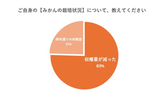 みかん生産者の83%が、昨年よりも収穫量が減っていると回答する結果となりました。不作の要因は、カメムシをはじめとする病虫害の大量発生や鳥獣被害との回答が約6割、夏の猛暑や干ばつなどの天候不順が直接的な要因となっているとの回答が約5割となりました。