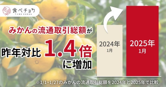 昨年夏の猛暑や害虫被害による影響を受け、みかんの価格が高騰しています。農林水産省の食品価格動向調査(※2)によると、令和7年1月14~16日の期間において、みかんの価格は前年比1.4倍に高騰しています。そのような中、食べチョクでは1月に入り、みかんの注文が殺到しており、流通金額が昨年同期比1.4倍(※3)に増加しました。