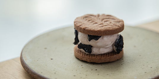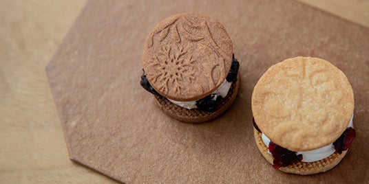 細やかな模様が入ったサクサクのサブレに、フルーティーな味わいのカカオ65%でリッチなクリームをサンド。長野から届いた葡萄をじっくりドライにし、チョコレート香るラムに漬け込んだ自家製ラムレーズンがたっぷり。