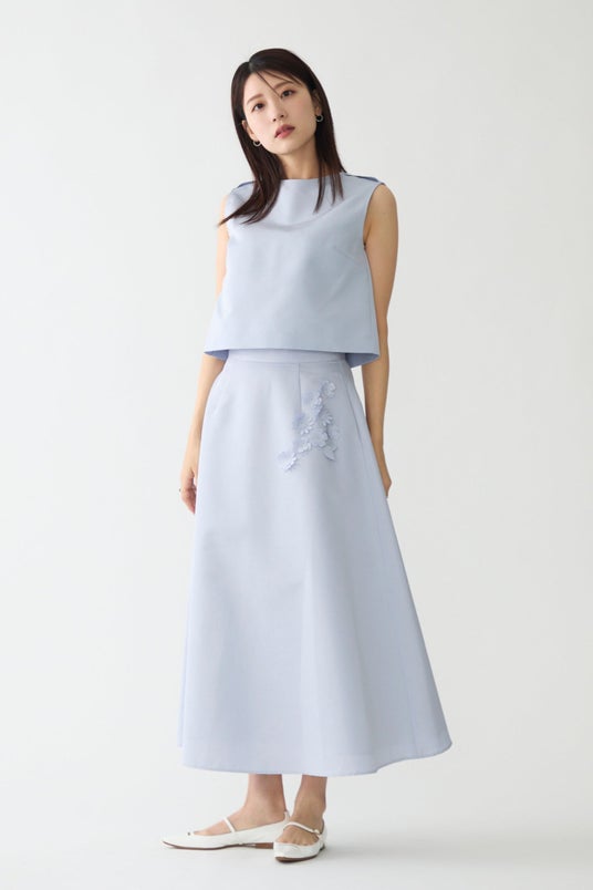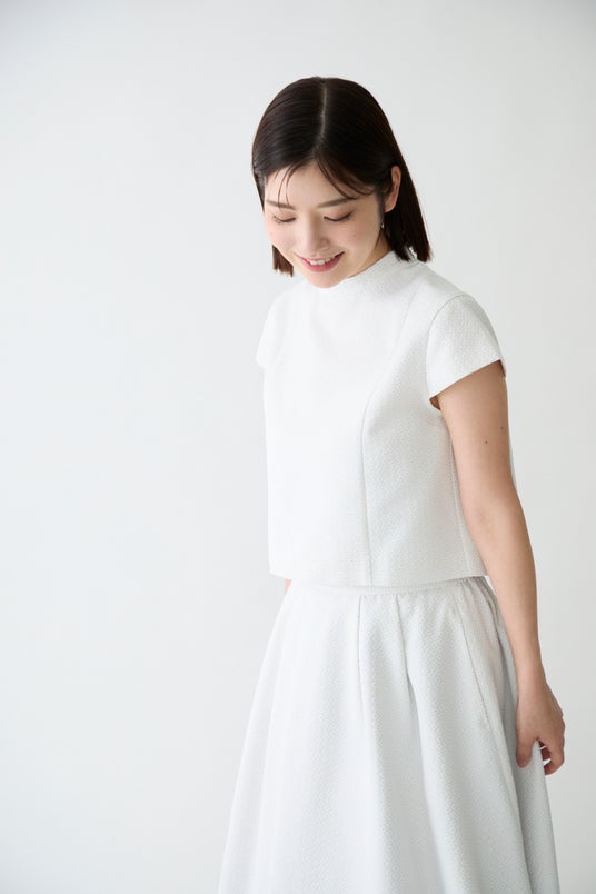 背面の丈が少し長くなり、首元のカットワークでより可憐な印象に仕上がりました。
