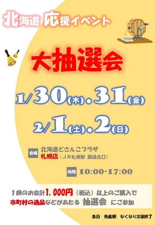 企業等の皆さまと道内市町村とのマッチング機会を創出する「ほっかいどう応援セミナーin札幌(1/30)」の関連企画として、セミナー参加市町村の逸品などが当たる「大抽選会」を「北海道どさんこプラザ(札幌店)」で開催しますので、是非、お越しください!