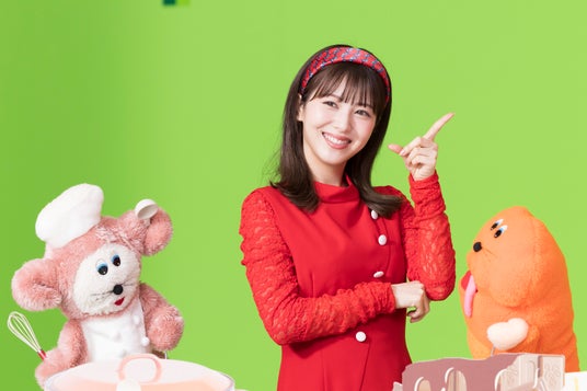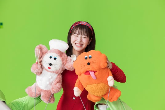 今回、オリジナルキャラクターのツクチャオ、タベチャオとの人形劇風のWEB動画に出演した浜辺さん。赤い服に水色のタイツ、鮮やかな赤いカチューシャを髪に留めてスタジオに現れ、監督から動画内容の説明を聞くときから、キャラクター名を一人で呪文のように復唱しながら「かわいい」とニコニコ。さらにキャラクターの詳細を聞くと、拍手しながら「本当にかわいい!」とベタ惚れしていました。