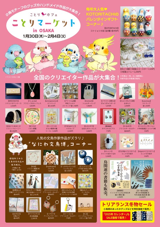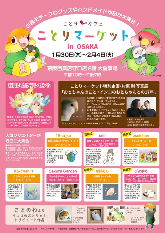 「小鳥たちを眺めながら、まったりコーヒータイム♪」をコンセプトにした「ことりカフェ上野本店」(http://kotoricafe.jp/)を運営する株式会社ことりカフェ(本社:東京都台東区 代表取締役 川部志穂)は、2025年1月30日~2月4日の6日間、京阪百貨店守口店(大阪府守口市)にて、「ことりマーケット大阪」(企画:ことりカフェ)を開催いたします。人気の小鳥を愛するクリエイター作品が全国より大集結!鳥まみれの素敵な作品が勢ぞろいした会場をお楽しみください。お菓子や飼育用品、あったグッズやカレンダーのセールコーナーございます。
