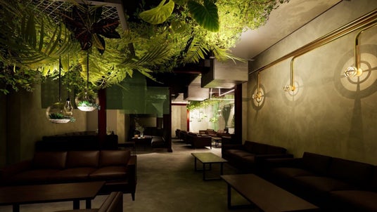 今回の店舗のテーマは「ボタニカル」。吊り下げ植物や壁面緑化を取り入れ、大型の植物のゆらめきと奥行きを演出します。これにより、空間全体が自然の豊かさに包まれるような雰囲気を実現。柔らかな間接照明と暖色系の光が植物の陰影を美しく際立たせ、訪れる人を優しく包み込む、癒しのボタニカル空間を提供します。