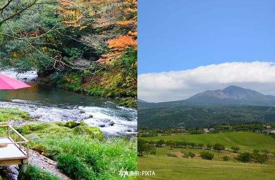 山中温泉の鶴仙渓(左)と霧島の霧島連峰