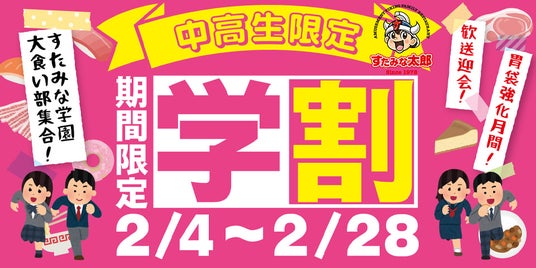 【すたみな太郎】2/4(火)~2/28(金)お得に焼肉、寿司、スイーツ食べ放題!「中高生学割!」「すたみな太郎アプリ スタンプ5倍キャンペーン!期間中毎日ご来店でなんと最大125個スタンプゲット!」