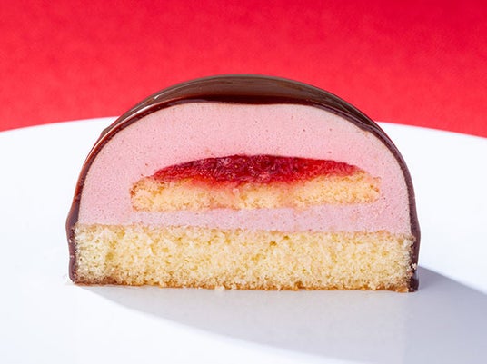 \2月1日発売/ストロベリームースとスポンジ、苺ソースを重ねグラッサージュショコラをかけ、可愛らしい猫の顔に仕立てました。節分期間中のみ、角ピックをつけた「小鬼黒猫ちゃん」が登場します!