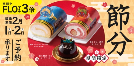 関東を中心に洋菓子・洋惣菜のテイクアウトショップ124店舗(2025年1月末現在)を展開する株式会社フロジャポン(本社:東京都武蔵野市)が運営するフロプレステージュでは、2025年2月1日(土)~2日(日)の節分期間限定で、毎年好評の"幸福と健康を祈る"「節分ロール」と、2025年新登場・可愛らしい「黒猫ちゃんのムースケーキ」を発売いたします。