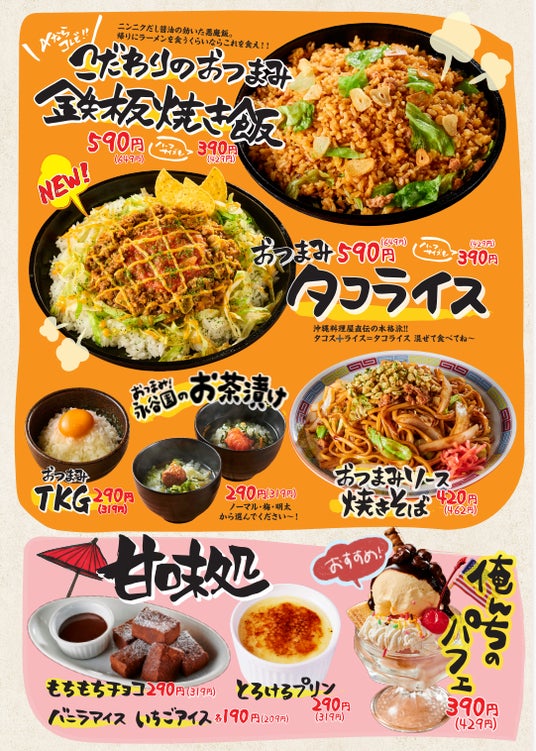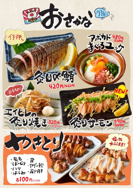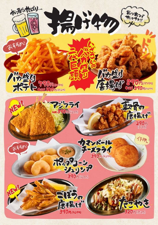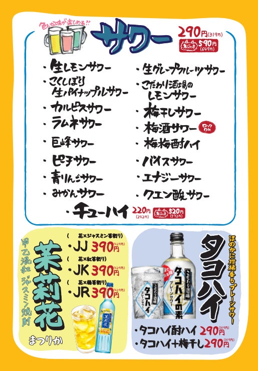 安くていろんなサワーが楽しめるドリンクメニューから、焼き鳥、揚げ物、鉄板焼きなどの定番居酒屋おつまみ、タコライスやパフェまでバラエティ豊かなメニューをそろえております。