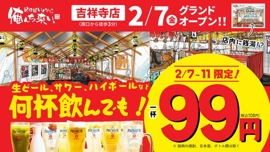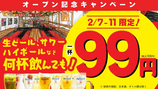 今回のオープンを記念して、生ビールやハイボール、サワー類が「何杯飲んでもドリンクが1杯99円(税込108円)」となるキャンペーンを開催します。2月7日(金)から2月11日(火)までの『5日間限定』なので、この機会にぜひお越しください。