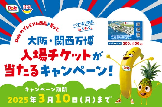 株式会社ドール(東京都中央区 代表取締役社長CEO 青木 寛、以下Dole)は、2025年4月13日(日)に開幕する大阪・関西万博を記念して、「大阪・関西万博 入場チケットが当たるキャンペーン」を、2025年2月1日(土)から3月10日(月)の期間で実施いたします。