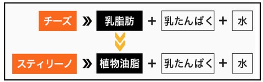 「スティリーノ」は、マリンフードが2007年に開発したチーズの主成分である乳脂肪の代わりに植物油脂を使用したチーズ代替素材です。乳脂肪の代わりに植物油脂を使用しているため通常のチーズと比較してコレステロールがカットされています。また、チーズと比較して植物油脂は価格高騰の上昇率が低く、原料の価格高騰に左右されにくい特徴があります。お客様へご提供する際は、スティリーノとナチュラルチーズの配合の割合を変えながら、多種多様な商品を展開することが可能です。