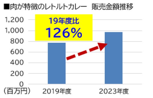 コロナ禍にレトルトカレーの喫食機会が増えた※2ことで、レトルトカレーにおいしさや満足感を求める方が増えています。特に肉が特徴のレトルトカレーは、2023年度の販売金額が2019年度比126%と伸長し※3、王道具材の"肉"にはさらなる期待が集まっています。